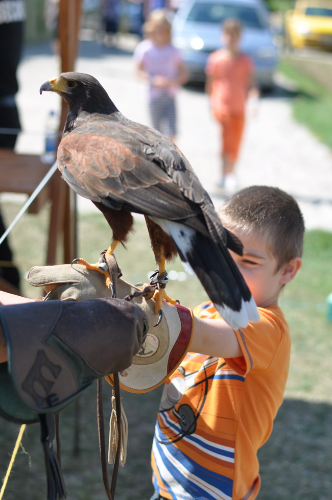 Sólyom ült a karján (egyébként akárhány rendezvényre megyünk, a solymászokat mindig támogatjuk. Egyrészt adunk nekik némi pénzt, másrészt hamar elhozzuk onnan a gyereket.)