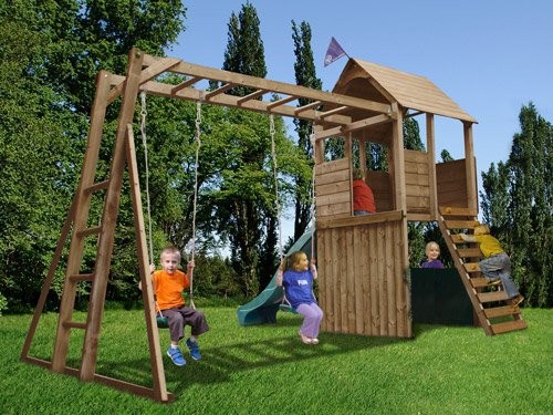 A játszótér egyébként egy csúcs: van egy központi modul, ahova a hintán kívül fel tudjuk majd akasztani az ikeás fészekhintát, a függőágyat, a kerti sátrat…